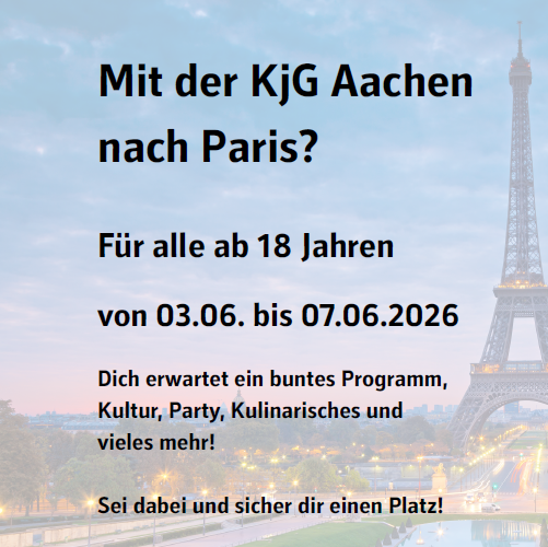 Du hast Lust vom 03.-07.06.2026 mit der KjG nach Paris zu fahren, dann melde dich gerne an.Die Kosten liegen für KjG-Mitglieder bei 100,00€Die genauen Infos zur Fahrt werden aktuell geplant.